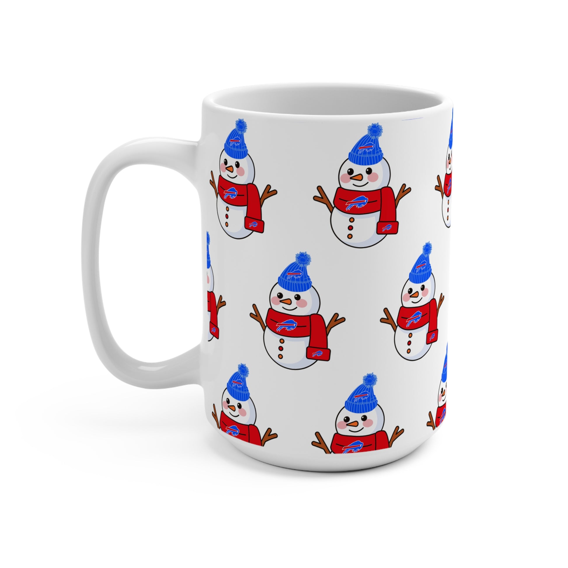 15oz Buffalo Snowman Pattern Mug — Cute Holiday Coffee Cup with Blue Hat & Red Scarf