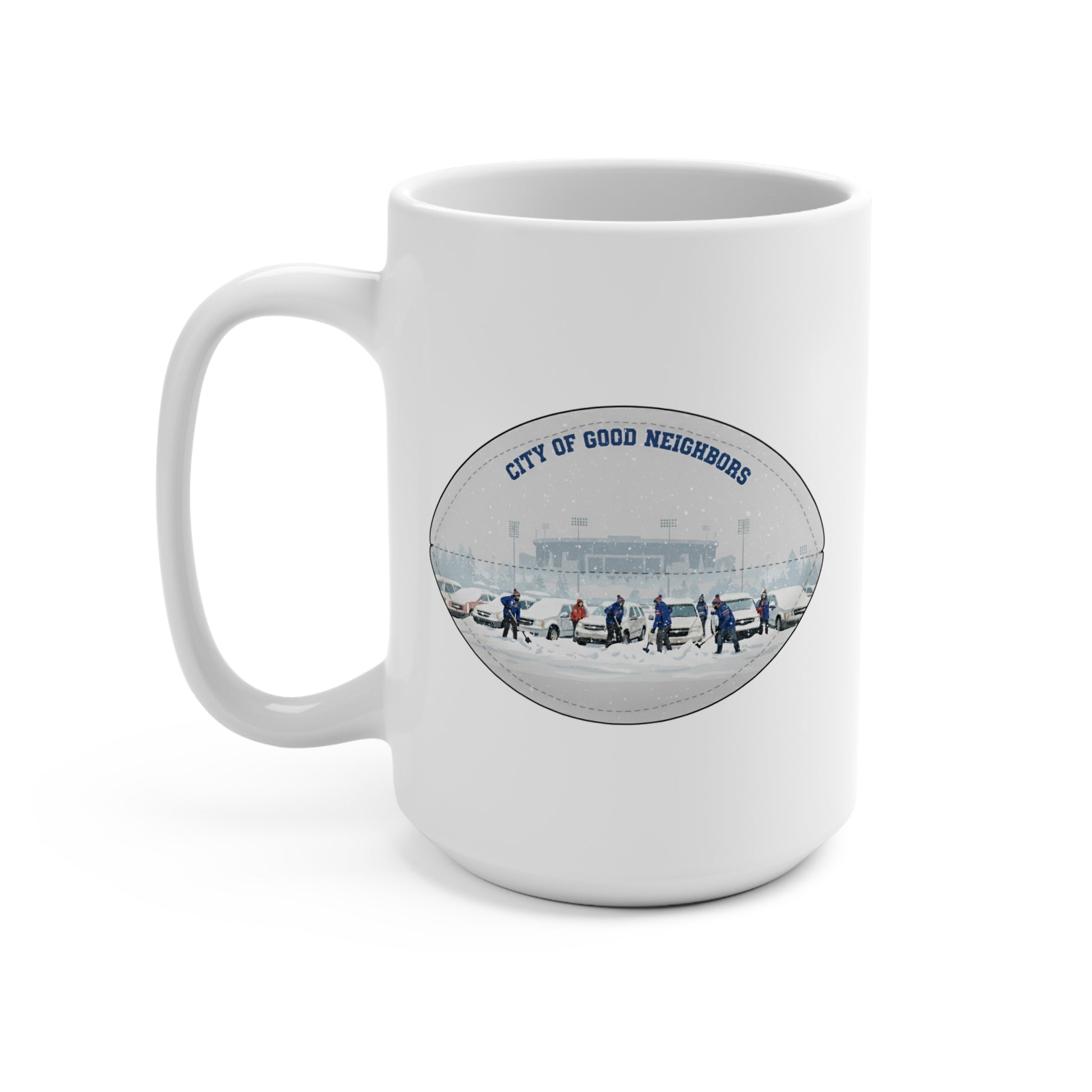 City of Good Neighbors 15oz Ceramic Mug — Vintage Winter Neighborhood Scene