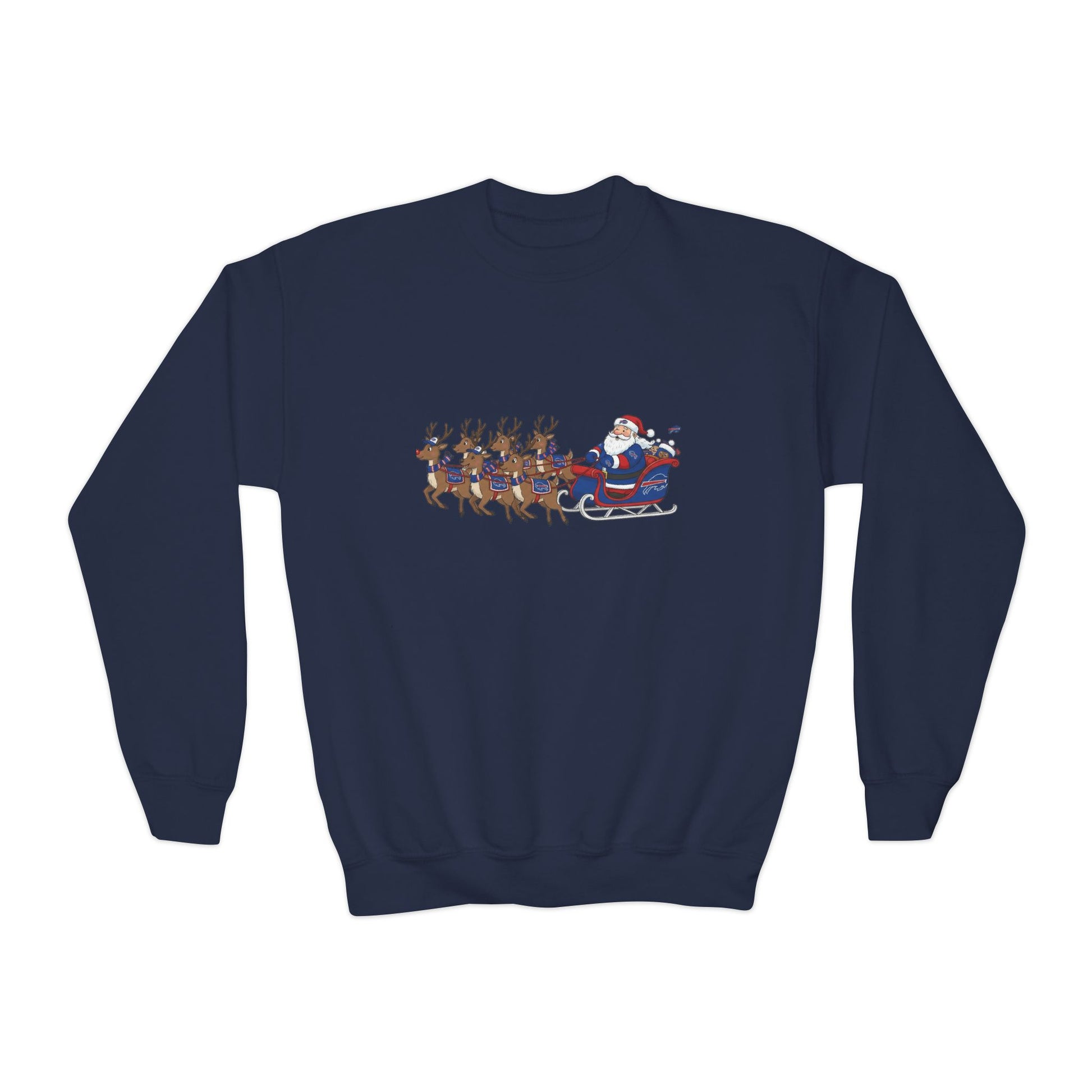 Kids Buffalo Christmas Crewneck Sweatshirt - Santa Sleigh & Reindeer Holiday Pullover